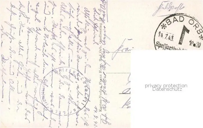 73803388 Bad_Orb Schwanenweiher Feldpost Bad_Orb postalisch gelaufen 1943 Erhaltung siehe scans [WerneD78] [WernPID7 ]