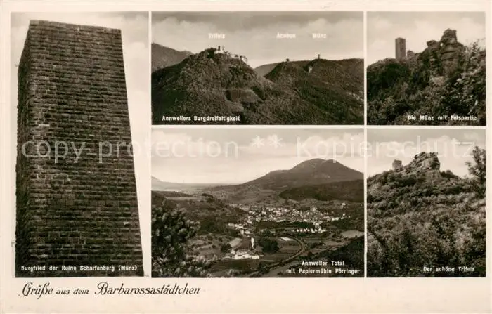 73803841 Annweiler_Trifels Bergfried der Ruine Scharfenberg Burgdreifaltigkeit Die Muenz mit Felspartie Panorama Annweiler_Trifels postalisch nicht gelaufen 1934 Erhaltung siehe scans [WerneD78] [WernPID7 ]