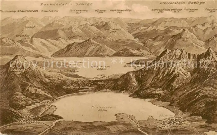 AK / Ansichtskarte 73808657 Walchensee Panoramakarte mit Kochel und Walchensee Walchensee