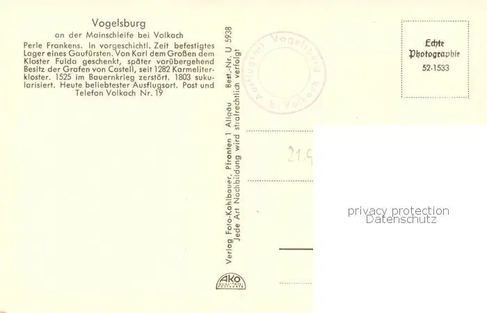 73809599 Vogelsburg_Volkach Kloster und aeltestes Weingut Frankens Vogelsburg Volkach postalisch nicht gelaufen 1921-1965 Erhaltung siehe scans [WerneD78] [WernPID7 ]