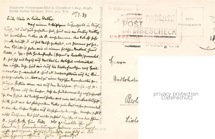 73809882 Oberstdorf Waldhotel Freibergsee Terrasse Alpenblick Oberstdorf postalisch gelaufen 1933 Erhaltung siehe scans [FriedD77] [Frierer ]