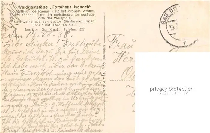 73810085 Bad_Duerkheim Waldgaststaette Forsthaus Isenach im Pfaelzerwald Bad_Duerkheim postalisch gelaufen 1938 Erhaltung siehe scans [FriedD77] [Frierer ]