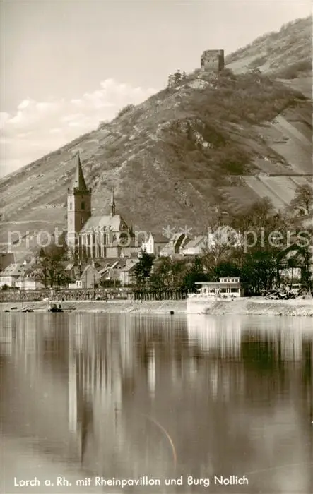 73810540 Lorch_Rheingau mit Kirche Rheinpavillon udn Burg Nollich Lorch Rheingau postalisch gelaufen 1958 Erhaltung siehe scans [WerneD78] [WernPID7 ]