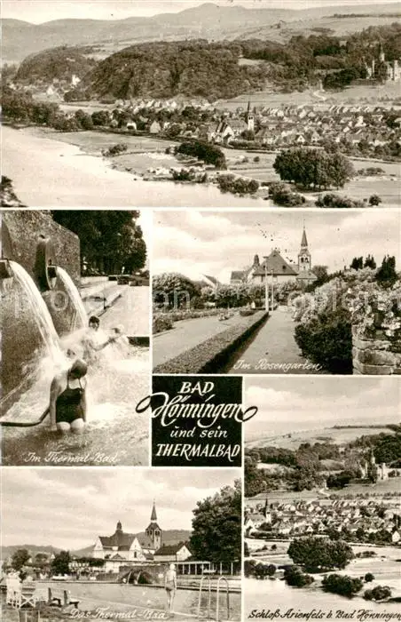 73810681 Bad_Hoenningen Panorama Thermal Bad Im Rosengarten Schloss Arienfels Bad_Hoenningen postalisch gelaufen 1956 Erhaltung siehe scans [WerneD78] [WernPID7 ]