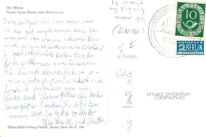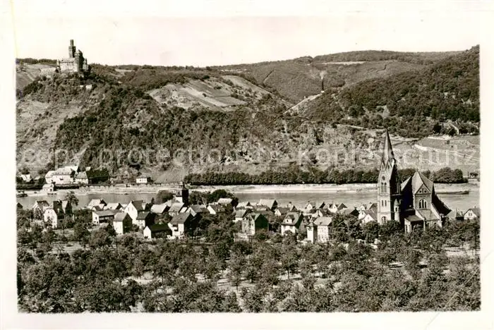 73810718 Niederspay mit Kirche und Marksburg Niederspay postalisch gelaufen 1952 Erhaltung siehe scans [WerneD78] [WernPID7 ]