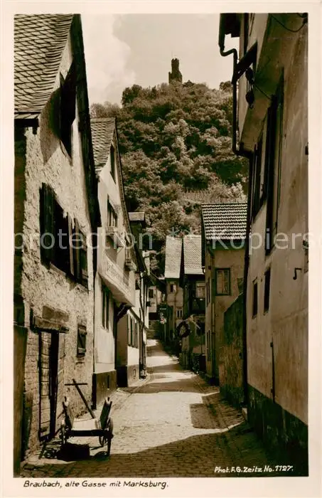 73810725 Braubach_Rhein Alte Gasse mit Marksburg Braubach Rhein postalisch gelaufen 1952 Erhaltung siehe scans [WerneD78] [WernPID7 ]
