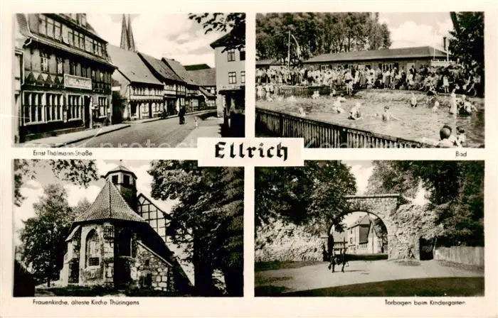 73810890 Ellrich Ernst Thaelmann Strasse Freibad Frauenkirche aelteste Kirche Thueringens Torbogen beim Kindergarten Ellrich postalisch gelaufen 1958 Erhaltung siehe scans [FriedD77] [Frierer ]