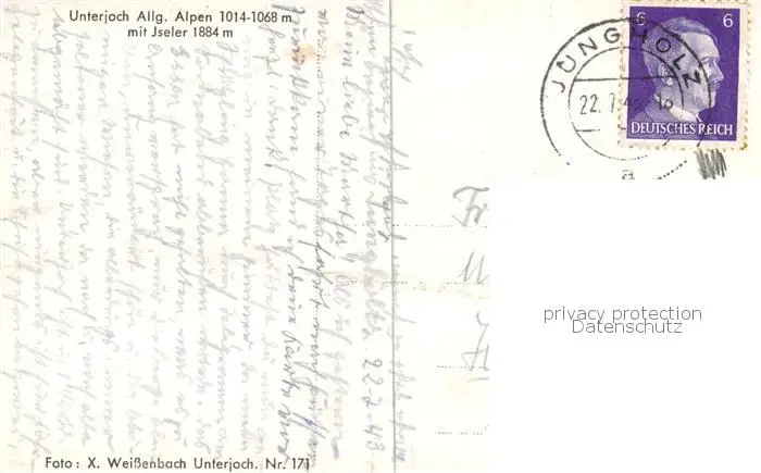 73810967 Unterjoch_Bad_Hindelang Landschaftspanorama Blick gegen Iseler Allgaeuer Alpen postalisch gelaufen 1943 Erhaltung siehe scans [FriedD77] [Frierer ]
