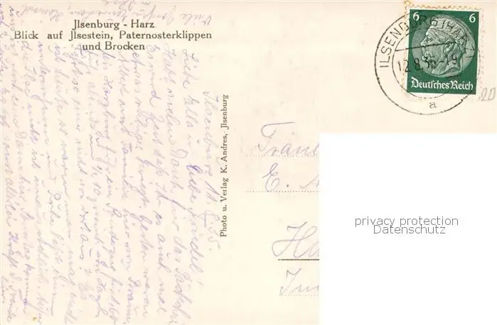 73811506 Ilsenburg_Harz mit Ilsestein Paternosterklippen und Brocken Ilsenburg Harz postalisch gelaufen 1936 Erhaltung siehe scans [WerneD78] [WernPID7 ]