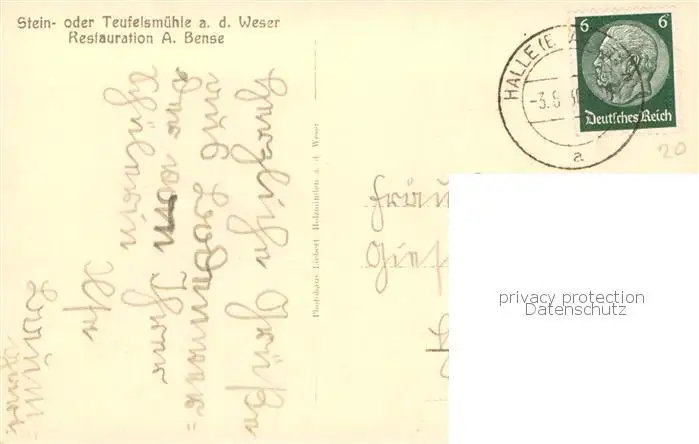 73812092 Steinmuehle_Pegestorf_Wesertal Blick ins Wesertal mit Stein oder Teufelsmuehle an der Weser postalisch gelaufen 1939 Erhaltung siehe scans [WerneD78] [WernPID7 ]