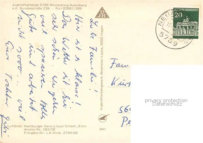 73812816 Astenberg_Schmallenberg Jugendherberge Fliegeraufnahme postalisch gelaufen nach 1965 Erhaltung siehe scans [WerneD78] [WernPID7 ]
