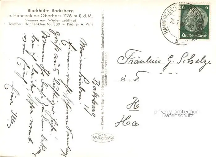 73812944 Hahnenklee-Bockswiese_Harz Blockhuette Bocksberg mit Turm Hahnenklee-Bockswiese postalisch gelaufen 1940 Erhaltung siehe scans [FriedD77] [Frierer ]