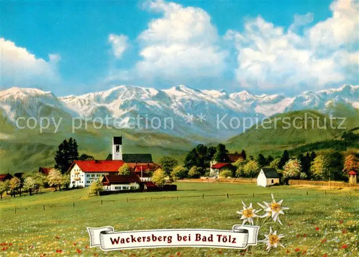 AK / Ansichtskarte 73813804 Wackersberg_Bad_Toelz Panorama mit Kirche und Benediktenwandgruppe Wackersberg_Bad_Toelz