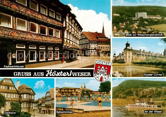 AK / Ansichtskarte 73813988 Hoexter_Weser Fachwerkhaeuser Dechanei Schwimmbad Weserberglandklinik Koster Corvey Weserpartie Hoexter Weser