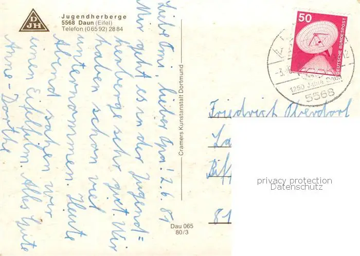 73814289 Daun_Eifel Panorama Jugendherberge Gastraum Eingang Daun_Eifel postalisch gelaufen 1980 Erhaltung siehe scans [FriedD77] [Frierer ]
