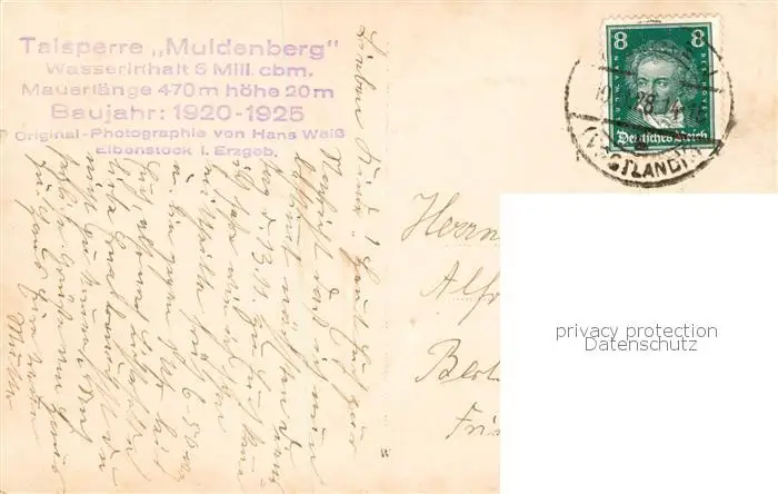 73816693 Talsperre_Muldenberg Panorama Sperrmauer Talsperre Muldenberg postalisch gelaufen 1928 Erhaltung siehe scans [FriedD77] [Frierer ]