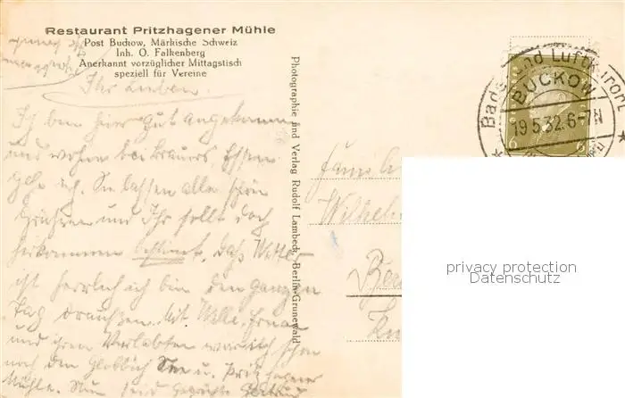 73817846 Bad_Buckow_Maerkische_Schweiz Restaurant Pritzhagener Muehle Bad_Buckow postalisch gelaufen 1932 Erhaltung siehe scans [FriedD77] [Frierer ]