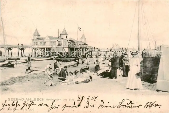 73818030 Ahlbeck_Ostseebad Strandleben und Steg Ahlbeck_Ostseebad postalisch gelaufen 1906 Erhaltung siehe scans [FriedD77] [Frierer ]