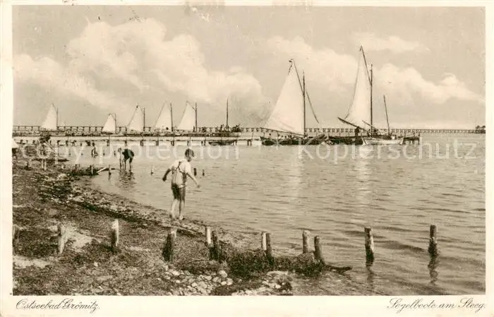 AK / Ansichtskarte 73818083 Groemitz_Ostseebad Segelboote am Steg Strand Groemitz_Ostseebad