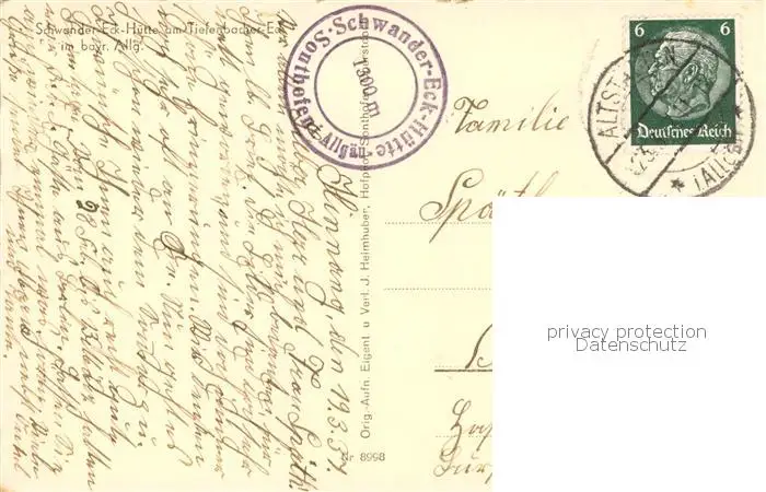 73820315 Schwander-Eck-Huette_Sonthofen_Oberallgaeu Ansicht postalisch gelaufen 1937 Erhaltung siehe scans [FriedD77] [Frierer ]
