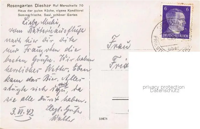 73821019 Merschwitz Rosengarten Diesbar Merschwitz postalisch gelaufen 1942 Erhaltung siehe scans [FriedD77] [Frierer ]