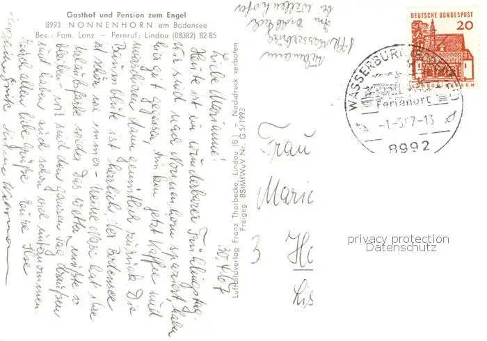 73821178 Nonnenhorn_Bodensee Fliegeraufnahme mit Gasthof Pension zum Engel Nonnenhorn Bodensee postalisch gelaufen 1967 Erhaltung siehe scans [WerneD78] [WernPID7 ]