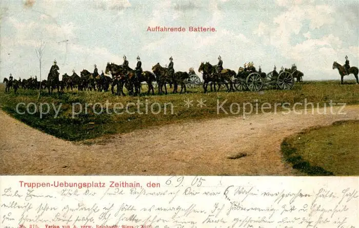 73821775 Zeithain Truppen uebungsplatz Auffahrende Batterie Zeithain postalisch gelaufen 1905 Erhaltung siehe scans [FriedD77] [Frierer ]