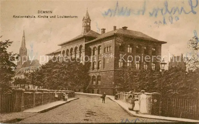 AK / Ansichtskarte 73822879 Demmin_Mecklenburg_Vorpommern Knabenschule Kirche und Louisenturm Demmin_Mecklenburg