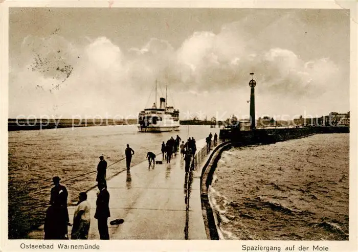73824055 Warnemuende_Ostseebad Spaziergang auf der Mole Warnemuende_Ostseebad postalisch gelaufen 1931 Erhaltung siehe scans [WerneD78] [WernPID7 ]