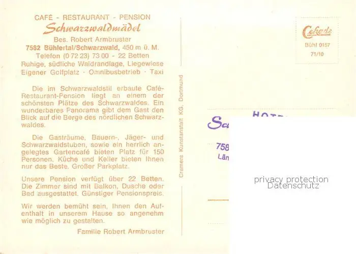 73829482 Buehlertal Pension Schwarzwaldmaegel Gastraeume Terrasse Schwarzwaelderin mit Bollenhut Buehlertal postalisch gelaufen nach 1965 Erhaltung siehe scans [FriedD77] [Frierer ]