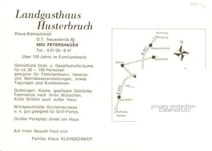 73829690 Petershagen_Weser Landgasthaus Husterbruch Gastraeume Garten Petershagen Weser postalisch nicht gelaufen nach 1965 Werbekarte (keine Postkarte) Erhaltung siehe scans [FriedD77] Werbekarte (keine Postkarte)[Frierer ]