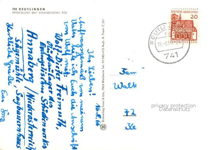 73829758 Reutlingen_BW Marienkirche Tuebinger Tor Lindenbrunnen Teilansicht und Achalm postalisch gelaufen 1968 Erhaltung siehe scans [FriedD77] [Frierer ]