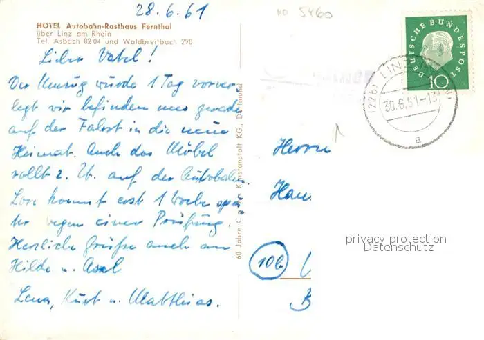 73829885 Waldbreitbach_Wied Hotel Autobahn Rasthaus Fernthal Waldbreitbach Wied postalisch gelaufen 1961 Erhaltung siehe scans [WerneD78] [WernPID7 ]
