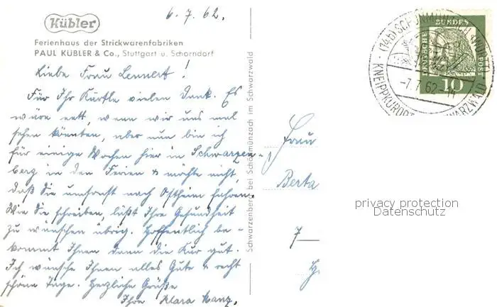 73831936 Schorndorf__Wuerttemberg Ferienhaus der Strickwarenfabriken Paul Kuebler postalisch gelaufen 1962 Erhaltung siehe scans [WerneD78] [WernPID7 ]