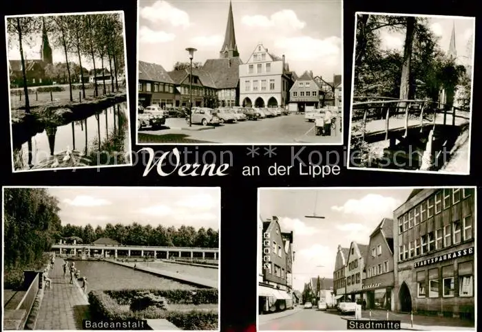 AK / Ansichtskarte 73832712 Werne__Lippe_Muenster_Westfalen Ortszentrum mit Kirche Parkanlagen Badeanstalt