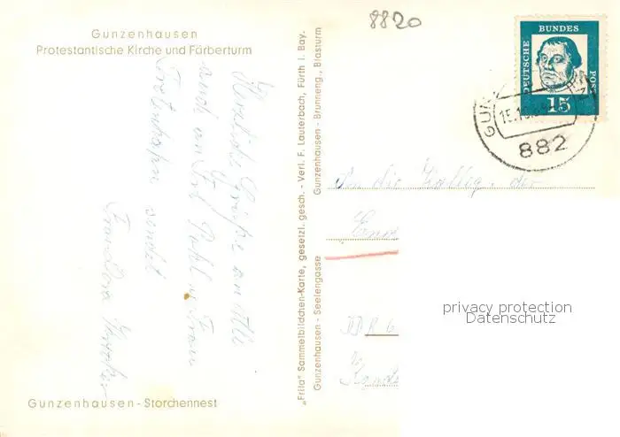 73833086 Gunzenhausen_Altmuehlsee Protest Kirche und Faerberturm mit Storchennest Gunzenhausen Altmuehlsee postalisch gelaufen 1965 Erhaltung siehe scans [FriedD77] [Frierer ]