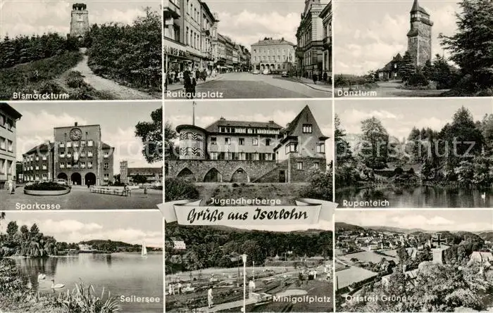 AK / Ansichtskarte 73833176 Iserlohn Bismarckturm Rathausplatz Danzturm Sparkasse Jugendherberge Rupenteich Seilersee Minigolfplatz TO Gruene Iserlohn