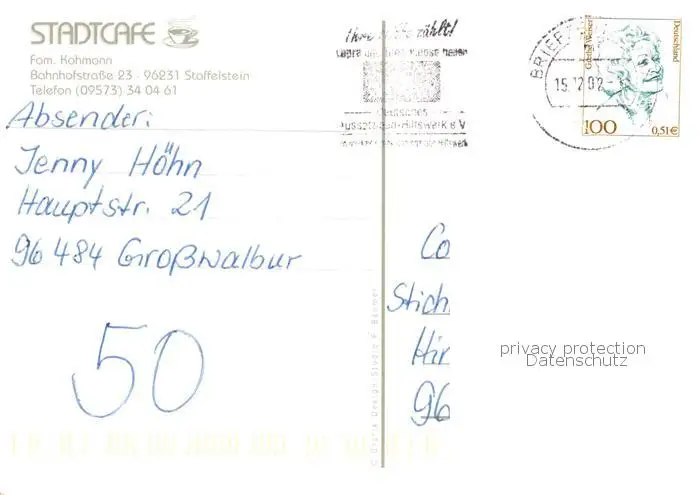 73834097 Staffelstein Stadtcafé Staffelstein postalisch gelaufen 2002 Erhaltung siehe scans [FriedD77] [Frierer ]