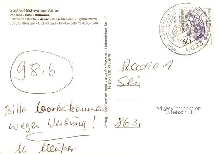 73834098 End Gasthof Schwarzer Adler Pension Café End postalisch gelaufen 1992 Erhaltung siehe scans [FriedD77] [Frierer ]