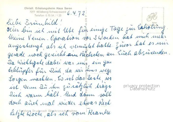 73834582 Wildberg_Schwarzwald Christliches Erholungsheim Haus Saron Wildberg Schwarzwald postalisch nicht gelaufen 1972 Erhaltung siehe scans [FriedD77] [Frierer ]