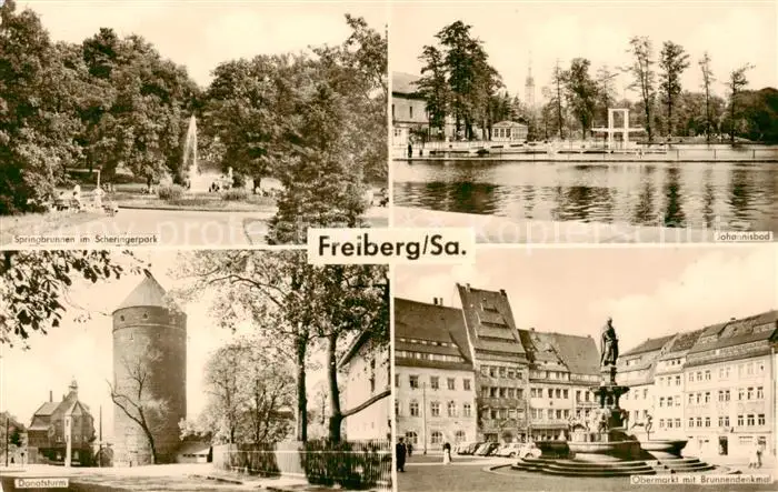 AK / Ansichtskarte 73835030 Freiberg__Sachsen Springbrunnen Scheringerpark Johannisbad Donatsturm Obermarkt mit Brunnendenkmal