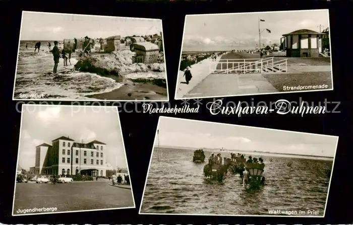 AK / Ansichtskarte 73835049 Duhnen_Cuxhaven Sturmflut Strandpromenade Jugendherberge Wattwagen im Priel