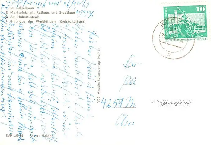73835152 Koethen_Anhalt Schlosspark Marktplatz Rathaus Stadthaus Hubertusteich Klubhaus der Werktaetigen Koethen Anhalt postalisch gelaufen 1974 Erhaltung siehe scans [WerneD78] [WernPID7 ]