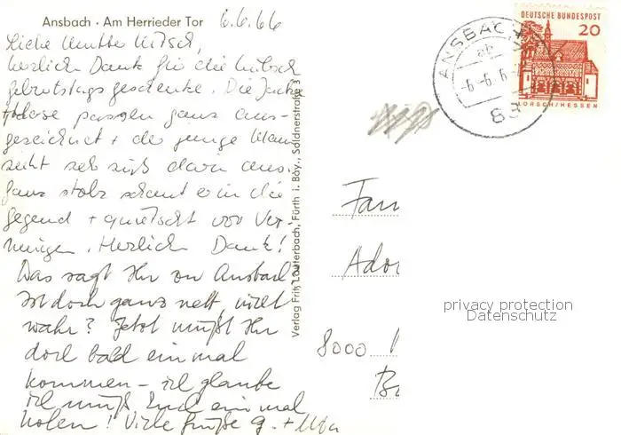 73835425 Ansbach_Mittelfranken Am Herrieder Tor Ansbach Mittelfranken postalisch gelaufen 1966 Erhaltung siehe scans [WerneD78] [WernPID7 ]