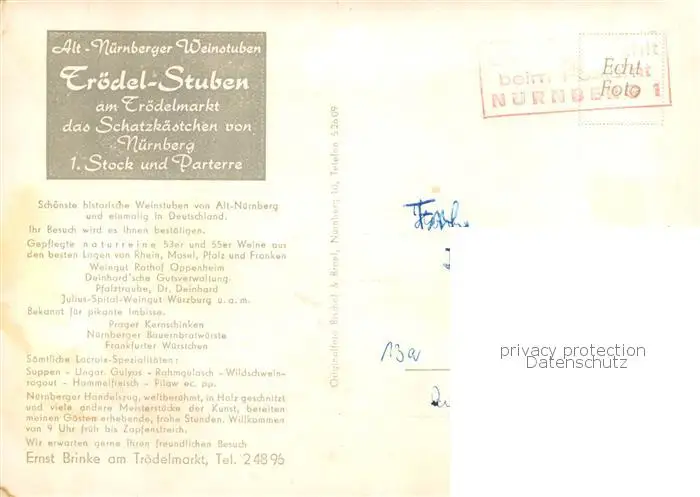 73835481 Nuernberg Alt Nuernberger Weinstuben Troedel Stuben Nuernberg postalisch nicht gelaufen 1921-1965 Erhaltung siehe scans [WerneD78] [WernPID7 ]
