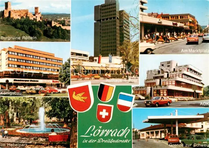 AK / Ansichtskarte 73835568 Loerrach Burgruine Roetteln Koenigsbau Im Hebelpark Rathaus Post Marktplatz AOK Grenze zur Schweiz Loerrach