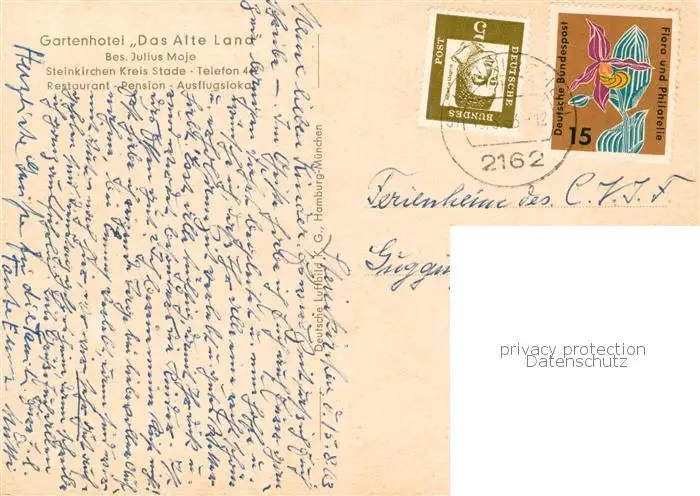 73835572 Steinkirchen_Stade Gartenhotel Das Alte Land Gastraeume Freiterrasse Steinkirchen_Stade postalisch gelaufen 1963 Erhaltung siehe scans [WerneD78] [WernPID7 ]