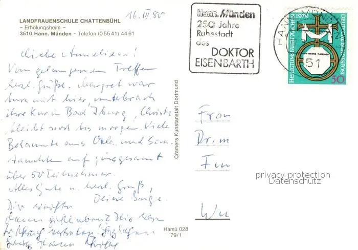 73835582 Hann._Muenden Landfrauenschule Chattenbuehl Hann. Muenden postalisch gelaufen 1980 Erhaltung siehe scans [WerneD78] [WernPID7 ]