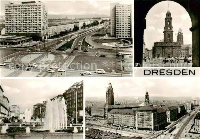 AK / Ansichtskarte 73835594 Dresden_Elbe Pirnaischer Platz und Grunaer Strasse Kreuzkirche Turm des Rathauses Wasserspiele Thaelmann Strasse Ecke Ring