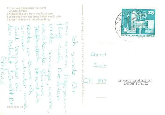 73835594 Dresden_Elbe Pirnaischer Platz und Grunaer Strasse Kreuzkirche Turm des Rathauses Wasserspiele Thaelmann Strasse Ecke Ring postalisch gelaufen nach 1965 Erhaltung siehe scans [WerneD78] [WernPID7 ]